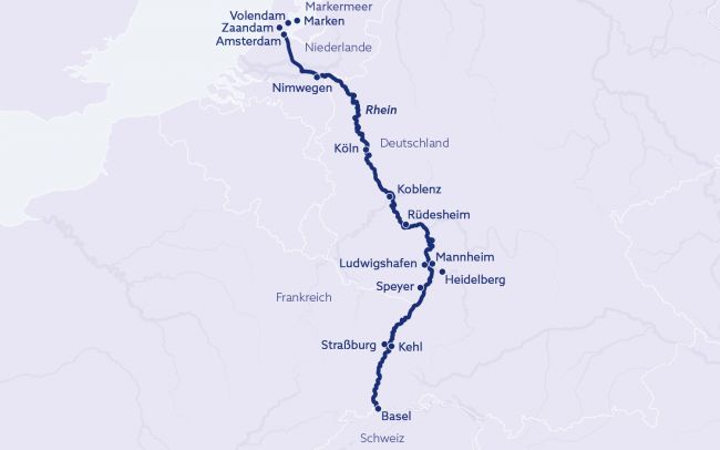 Basel - Straßburg - Mannheim - Rüdesheim - Koblenz - Köln - Amsterdam - Nimwegen - Köln